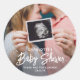 Adicione um toque elegante aos favoritos para festas do chá de fraldas, convites e notas de agradecimento com adesivos fotoredondos/selos de envelopes personalizados. O quadro e toda a redação desta modelo são simples de personalizar. A design neutra em termos de gênero é adequada a um novo bebê ou a uma rapariga, e também pode ser personalizada para um chá de fraldas de casais co-ed. (DICA DE IMAGEM: Uma maneira fácil de posicionar uma foto exatamente como você deseja é recortá-la antes de carregá-la no site do Zazzle.) O design mínimo de sobreposições em preto e branco apresenta caligrafia ousada com script, tipografia vintage art deco e uma foto de sua escolha, como uma foto de gravidez da mãe para ser grávida ou uma foto de maternidade de pais novos. Parabéns para a mãe ser!