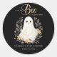 O pequeno Chá de fraldas de Boo Boho Ghost Halloween, Classic Round Sticker, apresenta um fantasma adoravelmente assustador, rodeado por botânicos boêmicos.