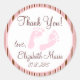 Clássico e eterno - Fundo listrado rosa e castanho com pegadas cor-de-rosa para bebês, obrigado seu adesivo de chá de fraldas. Excelente para favoritos para festas de hóspedes, sacos de presentes ou caixas de favor. Perfeito para um chá de menina. Disponível em outros estilos e cores — visite minha loja "A Princesa Húngara" em www.zazzle.com/hungaricanprincess*. Olhe na minha categoria de departamento "Oh Baby". Também vem em cores azuis para um chá de bebê! Parabéns!
