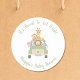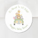 Os adesivos bonitos para o seu chá de fraldas com o tema safari, com uma ilustração de bebês (leão, zebra, elefante, girafa e macaco) amontoados num veículo de safari e "Está prestes a ficar selvagem!" e o nome da futura mãe num guião verde-selva.
