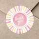Este design de adesivo redondo apresenta um sol vibrante com um centro cor-de-rosa macio, com a frase alegre "Obrigado!" colocada em cima. Os raios solares brilham em tons quentes de amarelo, laranja, rosa e vermelho, acrescentando um toque brilhante e alegre ao seu chá de fraldas. Ao cercar o sol, a "Chá de fraldas de nome da Mãe" e a data do chá, o estilo é elegante em uma mistura de fontes cor-de-rosa e branca, criando uma aparência perfeita e personalizada. Este adesivo é uma adição perfeita a favores, presentes de obrigado-vocês, ou decorações, amarrando lindamente sua celebração com o tema do sol. Totalmente personalizável, você pode atualizar o nome e a data para corresponder aos detalhes do evento. Uma maneira doce e atenciosa de mostrar apreço aos seus convidados!