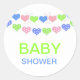Um design bonitinho com cordas coloridas de coração com as palavras 'chá de fraldas' em letras brilhantes e negrito.
