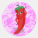 Um personagem de desenho animado de pimenta vermelha e quente. Design original com padrão de renda rosa no fundo.