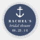 Os adesivos clássicos de chá de panela náutica apresentam uma borda de corda branca trançada e uma ilustração de âncora de uma nave em um rico fundo azul marinho, com seu texto personalizado — nome do convidado de honra, tipo de evento e data. Corresponde aos nossos convites de chá de panela e acessórios de apoio de corda náutica.