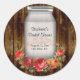 design de chá de panela com jarro de Mason e conjunto de rosas e flores coloridas em forma de coroa, numa imagem de fundo da prancha de madeira castanha escura. Um tema de verão ao ar livre rústico para um chá de panela de tema de país ou cabine. Conselhos de madeira marrom-escura, ricos em madeira, provenientes de uma vedação antiga ou de painéis de flutuação, contrastam com o belo gráfico floral bonito. © CustomInvitesOnline.com