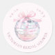 Um adesivo giro, chá de panela redondo, com uma bola brilhante na discoteca, com uma arco de rosa claro e fontes elegantes em que todas as suas informações personalizadas são escritas. Você pode encontrar produtos correspondentes desta coleção em nossa loja.