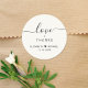 Um adesivo de creme leve para os favores do seu casamento e cartas de agradecimento com "obrigados + amor" em letras simples e um roteiro elegante com sujeira, seus primeiros nomes se juntaram por um coração e sua data de casamento.