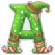Playful Christmas elf shaped like the letter A wearing a green hat, red boots and mittens; a festive holiday alphabet full of whimsy, stars, jingle bell details and seasonal cheer.