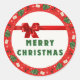 This is a round Merry Christmas wreath sticker featuring a festive red ribbon and holiday-themed illustrations such as Christmas trees, holly, and gift envelopes.