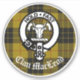 Na moda round vinil decal apresenta o crachá da crista de Clan MacLeod e texto personalizável sobre fundo tartano