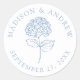 Add a polished finishing touch to your wedding details with these classic blue hydrangea wedding stickers. The design features a hand-drawn blue hydrangea centered on a white background, surrounded by the couple’s names and wedding date in a circular layout for a balanced and elegant presentation. Perfect for sealing envelopes, labeling favor bags and boxes, or using on welcome bags, these stickers coordinate beautifully with spring and summer weddings, garden settings, and coastal celebrations. A versatile and stylish accent for your wedding stationery and day-of wedding details.