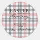 This elegant easter label features a blush pink and gray plaid pattern and prominently displays the classic message "Easter Greetings." It includes shades of pastel pink and gray, evoking a classy and nostalgic English Easter holiday atmosphere. You can easily personalize the label with your family's name. This sticker is perfect for decorating your Easter mail or sweet treats in a traditional colonial style, as well as for a charming country cottage or log cabin theme.
