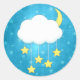 Estrelas são suspensas de uma nuvem contra um fundo azul texturizado e estrelado. Uma lua amarela espia por trás da nuvem.