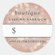 Os autocolantes quadrados de cobre com um fundo de rosa dourado de cobre exibem três linhas de texto personalizado (mostradas com seu nome de butique e site) e um campo preto para preços escrevendo à mão. Se solicitar adesivos em massa para determinados pontos de preço, use a função Personalizar para adicionar seu preço pré-impresso.