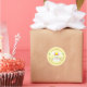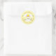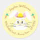 Um adesivo de endereço de devolução redondo amarelo fofo com um coelho de desenho animado branco . Este design também está disponível em vermelho , azul e verde .