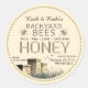 Separe-se das marcas dos supermercados e das operações comerciais. Três colmeias ("Abelhas de quintal/Colmeias de quintal") num recheio de erva com pequenas abelhas cercadas por um círculo de quadrados pontilhados. Feliz apicultura!