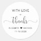 Obrigado elegante que você cola para seus favores de recepção de casamento e cartas de agradecimento que incluem "Com amor + Obrigados" em uma simples tipografia moderna e um roteiro na moda elegante com baloiços, seus primeiros nomes se juntaram por um coração e sua data de casamento.