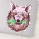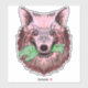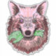 Ilustração ousada de lobo com toque surreal—pelagem rosa e vermelha, olhos desalinhados penetrantes e uma reviravolta macabra enquanto segura uma mão de zumbi. Um design vívido e simbólico perfeito para fãs de arte de fantasia sombria e mercadoria de destaque