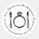 Adicione um toque inteligente aos brindes do seu casamento com este adesivo redondo preto e branco "Coma, Beba e Case". Uma ilustração caprichosa apresenta um anel de noivado como um prato de jantar ladeado por um garfo e uma faca, com o texto "Coma, Beba e Case! Obrigado por Celebrar Conosco" envolvendo a borda. A paleta clássica em preto e branco mantém o design versátil e elegante. Perfeito para sacolas de brindes, caixas de presentes ou garrafas de vinho. Todo o texto é totalmente personalizável.