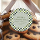 Adesivos festivos de verificação verde para biscoitos de Natal, guloseimas caseiras, doces e lembrancinhas de festa. “Feito com amor” em letras elegantes.