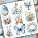 Adesivo do Conjunto de Páscoa Azul 2. © Escolha um Adesivo. Esta folha de adesivos tem desenhos de Páscoa em azul com flores, coelhos, uma borboleta, ovos, um ninho, uma vela e uma grinalda.