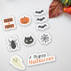 Um conjunto de adesivos para presentes de Halloween, decoração e diversão com "Trick or Treat", jack o lanterno, abóbora, morcegos, aranha, gato preto, teia de aranha, fantasma e Feliz Halloween em cores preto e laranja!
