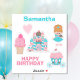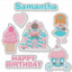 Personalize este conjunto fofo de sete doces trata adesivos temáticos de aniversário com o nome de seu filho para seus livros adesivos, cartas de cartas ou projetos de decoração de presentes. Imagens de um castelo doce, cone de gelado, uma garotinha com cupcake e mais certeza de apelar para crianças. Sua escolha de tamanho e termina.