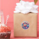 Um adesivo bonito de um biscoito redondo grande gelado com flores em fundo roxo.