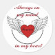 Coração com Asas e Citação "sempre na minha mente para sempre no meu coração" Criam adesivos personalizados para cada ocasião! Procure nossa seleção de designs ou faça o upload de sua própria foto, logotipo ou texto. Disponível em 7 formas, escolha de acabamento mate ou brilhante e impresso com impressão a cores de alto nível em cheio, esses adesivos são perfeitos para tudo, desde mensagens especiais e o rascunho até atividades infantis e exibição do seu estilo pessoal. Disponível em 2 tamanhos Grande: 3" de diâmetro, 6 adesivos por folha Pequeno: 1,5" de diâmetro, 20 adesivos por folha Impressos em papel isento de ácido Escolha do acabamento mate ou brilhante Use o botão "Personalizar!" para escolher entre 7 diferentes formas Alta qualidade, cor do cheio, impressão com sangramento de cheio Frente resistente ao cratch, pele fácil e cola