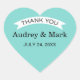 O design de adereço de casamento personalizado apresenta um estilo chic e sofisticado. O adesivo em forma de coração inclui um detalhe de fita branca com o texto personalizado "Obrigado" e o monograma dos nomes de noiva e noivo e a data do casamento. Esquema de cor azul, preto e branco do ovo de Aqua / robin.