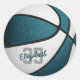 Estas cores da equipe são adequadas para meninas ou meninos e apresentam a imagem realista de uma bola de basquete que tem painéis brancos e teais alternados - personalize com o nome do jogador em uma fonte do estilo "autógrafo" que cobre o número de camisa do atleta - por katz_d_zynes
