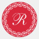 Um adesivo vermelho com borda de coroa de louro branca e monograma personalizado que você pode editar com seu próprio monograma. Para alterar a fonte ou mover a inicial para centralizá-la, escolha o botão "personalizar".