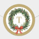 Um design de adesivo de Natal redondo elegante e atemporal com uma coroa de sempre-verde pintada à mão com uma fita vermelha e monograma personalizável em dourado. Edite facilmente o monograma com a inicial do seu sobrenome.