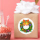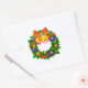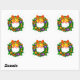 Esta imagem é um adesivo festivo e colorido da coroa de Natal com galhos verdes de pinheiro enfeitados com ornamentos brilhantes em vermelho, ouro, roxo e laranja. Inclui ouros, fitas vermelhas, estrelas pequenas e um grande arco laranja no topo. As palavras "Feliz Natal" aparecem em letras amarelas a negrito através do centro, e fazer-o como uma decoração alegre de férias perfeita para cumprimentos ou designs festivos.