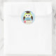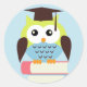 Um adesivo de graduação para crianças bonito, com uma coruja verde e azul sentada sobre uma pilha de livros. Graphics ©Babystar Design.