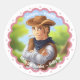 Promova seu negócio equestre e marca em envelopes, correspondências, pacotes e itens promocionais com esses adesivos personalizados que apresentam uma ilustração desenhada à mão de um belo cowboy usando um chapéu e uma bandana, rodeado por uma borda trendy com recorte rendado. Personalize o texto para atender às suas necessidades. Esses adesivos também são adequados para álbuns de recortes, festas temáticas de cowboy, festas de aniversário de equitação, convites ou lembrancinhas de agradecimento.