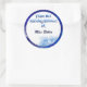 Uma etiqueta de presente personalizada de panificação ou enlatamento com letras decoradas com flocos de neve em azul sobre um medalhão branco contra a arte de Natal com um padrão elegante de pinheiros e pinecones em azul e branco sobre um fundo gelado de blues e violeta.