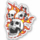 Esta imagem intensa apresenta vários crânios envoltos em chamas. Os crânios são reproduzidos em estilo gráfico detalhado, com suas cestas oculares vazias e bocas abertas transmitindo um senso de ameaça. As chamas ao redor dos crânios são representadas em uma cor de laranja e amarelo vibrante, criando um efeito visual dramático e poderoso. A composição global é caótica e enérgica, sugerindo um senso de perigo e destruição.
