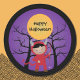 Alguns autocolantes pretos e roxos com uma criança asiática a vestir uma fantasia diabólica para fazer truques ou tratar. O texto é editável. © ArianeC Ilustrações — Todos os direitos reservados