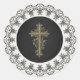 Esta é uma bela imagem tradicional religiosa católica de um crucifixo de ouro num fundo negro com uma fronteira decorativa.
