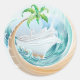 Sonho de águas tropicais com esta ilustração a cores do cheio, com um navio de cruzeiro que atravessa ondas tropicais oceânicas com palmeira.