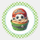 Round sticker is shown with a cute cupcake birthday sports soccer/basketball print.