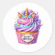 Round sticker is shown with a cute cupcake birthday unicorn print.
