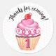 Cupcake Obrigado Garota Rosa primeiro aniversario Clássico Adesivo Redondo Redondo Adorável, feminino, adesivo de cupcake rosa ilustrado com "Obrigados para vir!" por cima. Padrão de bolinhas cor-de-rosa no fundo. Perfeito para levar para casa bolsas boas.