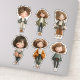 Each sticker shows a full-body standing chibi girl character with soft facial features, rosy cheeks, and peaceful expressions, presented in slightly varied poses, outfits, and accessories while maintaining a cohesive and harmonious look.