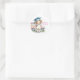 A cheerful kindergarten graduation sticker featuring a curly‑haired child in a blue cap celebrating in front of a pastel pink school bus surrounded by daisies and greenery. The soft colors and playful artwork create a sweet, joyful design perfect for marking this early‑school milestone.