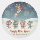 Add festive charm to your holiday season with these adorable watercolor stickers featuring playful mice in colorful knitted hats and scarves watching fireworks in a snowy winter scene. A happy mouse soars into the night sky on a rocket while the others cheer below, spreading cozy winter joy and New Year excitement. The text “Happy New Year” and the sender name are customizable, making it easy to create a personal touch for your cards, gifts, or party favors. The charming boho watercolor style brings warmth and whimsy to every celebration. Perfect for families, kids, and anyone who loves cute woodland animals and cheerful winter art. Part of a collection with matching cards and party supplies.