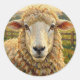 A cute sticker with a cute ewe with an adorable impasto style sheep on an old rustic farm looking at you.