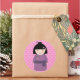 Boneca Kokeshi japonesa desenhada digitalmente. Roxos e rosas. Flores no cabelo e no quimono.