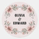 Celebre o seu dia especial com este adesivo de casamento personalizado e elegante com os nomes “Olivia & Edward”. Rodeado por uma delicada moldura floral em tons suaves de rosa e verde, este adesivo redondo é perfeito para adicionar um toque pessoal às suas lembranças de casamento, convites ou cartões de agradecimento. Criado para ocasiões memoráveis, é uma lembrança ideal para casais que desejam adicionar um elemento personalizado à sua celebração.